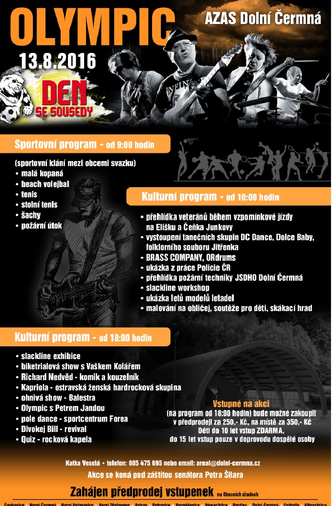 Přílohou pozvánky je podrobný program akce. Vstupenky jsou v předprodeji za 250,-Kč zde na OU. Soutěžící ve sportovních disciplínách reprezentující naši obec se také mohou přihlásit na OU v H. Třešňovci . V ceně startovného je vstupenka na večerní program v ceně 350,-Kč, občerstvení na sportovišti. Pro první tři místa jsou připraveny věcné ceny !