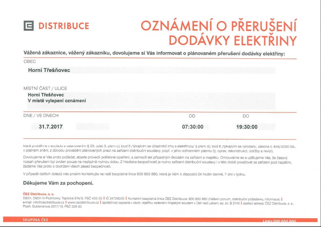 Oznámení o přerušení dodávky elektřiny 31.7.2017 12 července, 2017 napsal(a) Jan Dušek ml. v kategorii Aktuality Plánované přerušení dodávky elektřiny 31. 7. 2017 od 7:30 do 19:30 v úseku od Kubešových po Gufero.