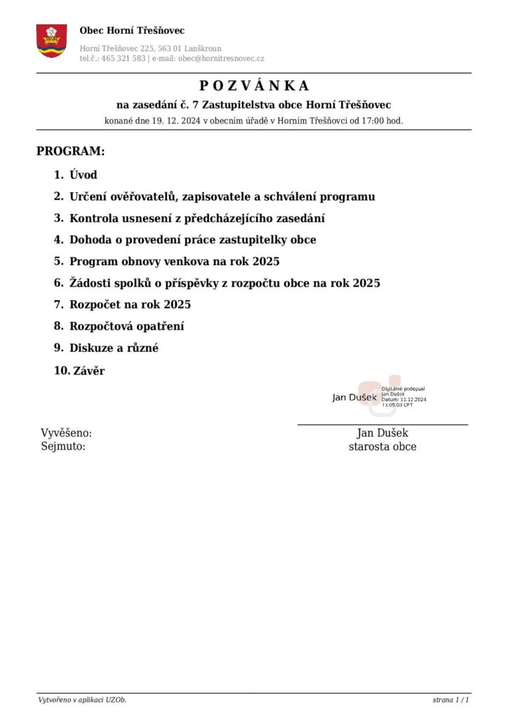 Pozvánka na jednání ZO dne 19.12.2024 17 prosince, 2024 napsal(a) Petra Marková v kategorii Aktuality https://urednideska.alis.cz/obec-horni-tresnovec/vyveseni/300