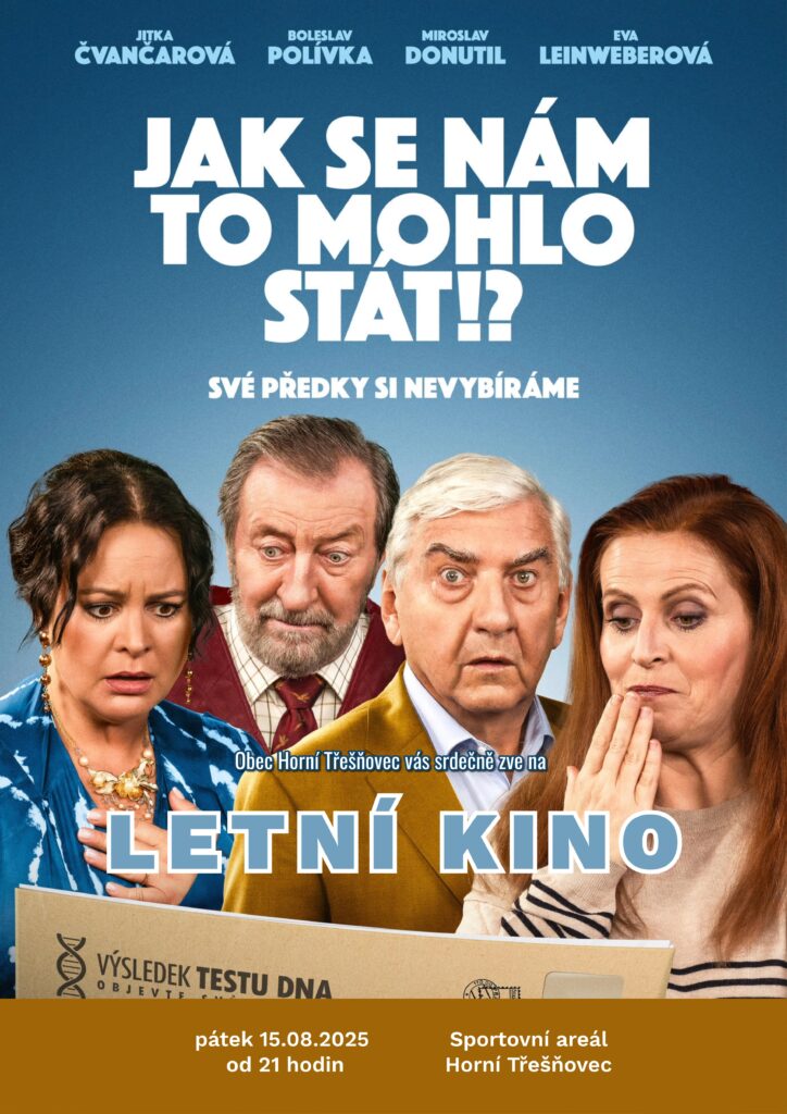 Obec Horní Třešňovec Vás srdečně zve na promítání filmu „Jak se nám to mohlo stát!?“ v pátek 11. 8. 2025 na fotbalovém hřišti (areál bude otevřen cca od 19 hodin). V případě špatného počasí bude akce přesunuta do Kulturního domu. Vstupné je dobrovolné. Občerstvení zajištěno.