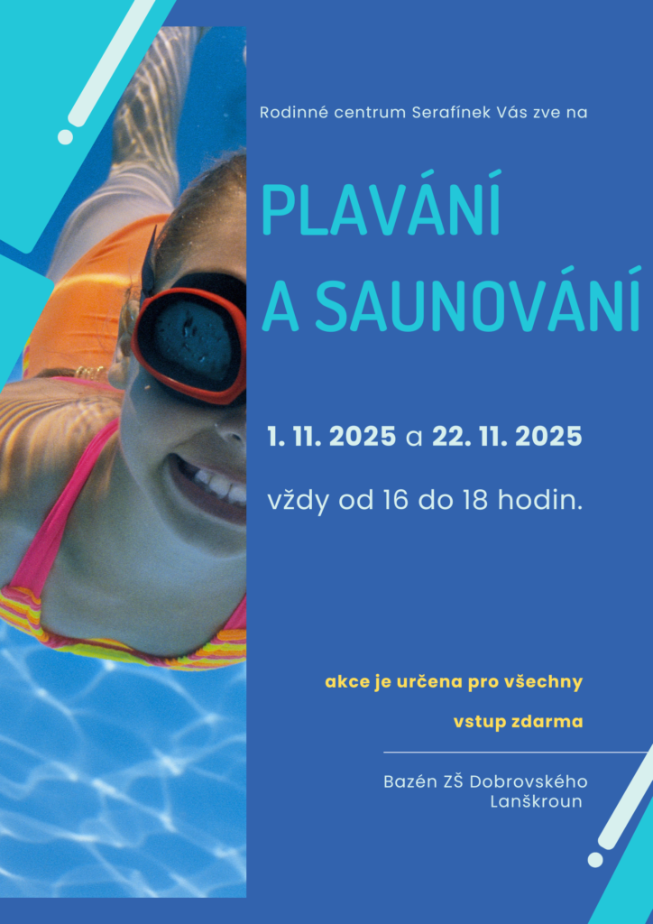 Pozvánka plavání a saunování 1.11. 28 října, 2025 napsal(a) Rodinné centrum Serafínek v kategorii Aktuality, Rodinné centrum Serafínek