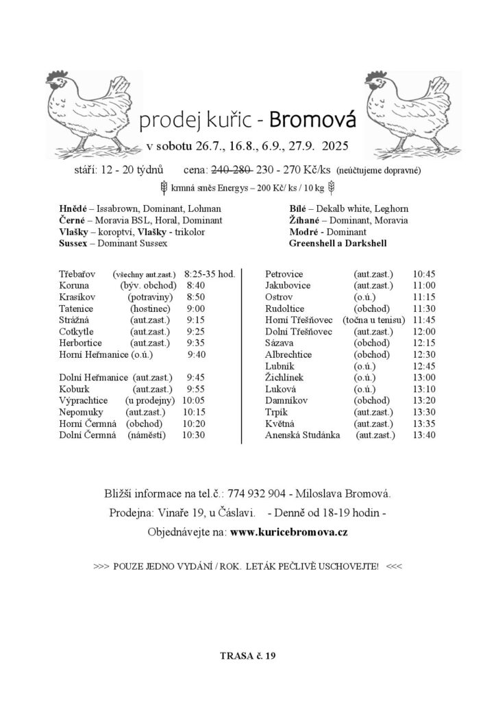 Paní Bromová bude prodávat slepice různých barev, cena od 230 Kč/kus dle stáří kuřic. Prodej se uskuteční v sobotu 26.7., 16.8., 6.9. a 27.9. u točny u tenisu v 11:45 hod.