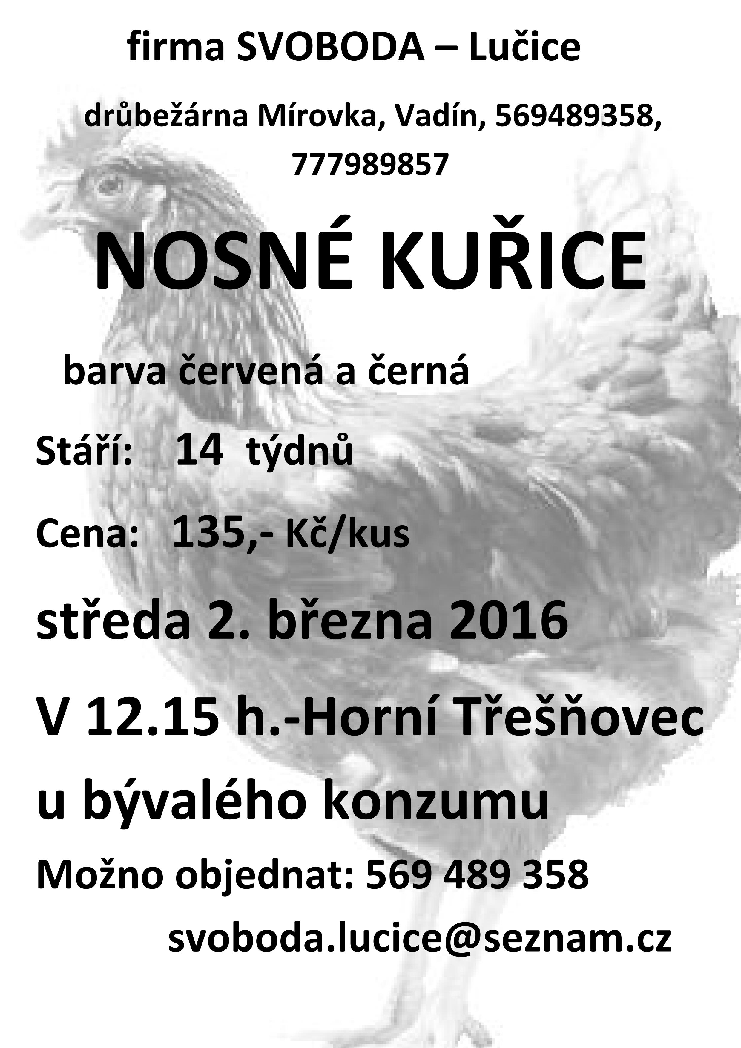 Prodej nosných kuřic – 2. 3. 2016 29 února, 2016 napsal(a) Jan Dušek ml. v kategorii Aktuality Prodej kuřic – Svoboda (staženo 204× )
