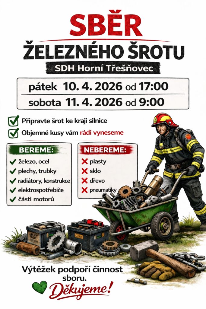 Sběr železa se už blíží a my Vám předem za železný odpad moc děkujeme. V případě větších kusů nebo když nemůžete vynést odpad, kontaktujte někoho s hasičů.
