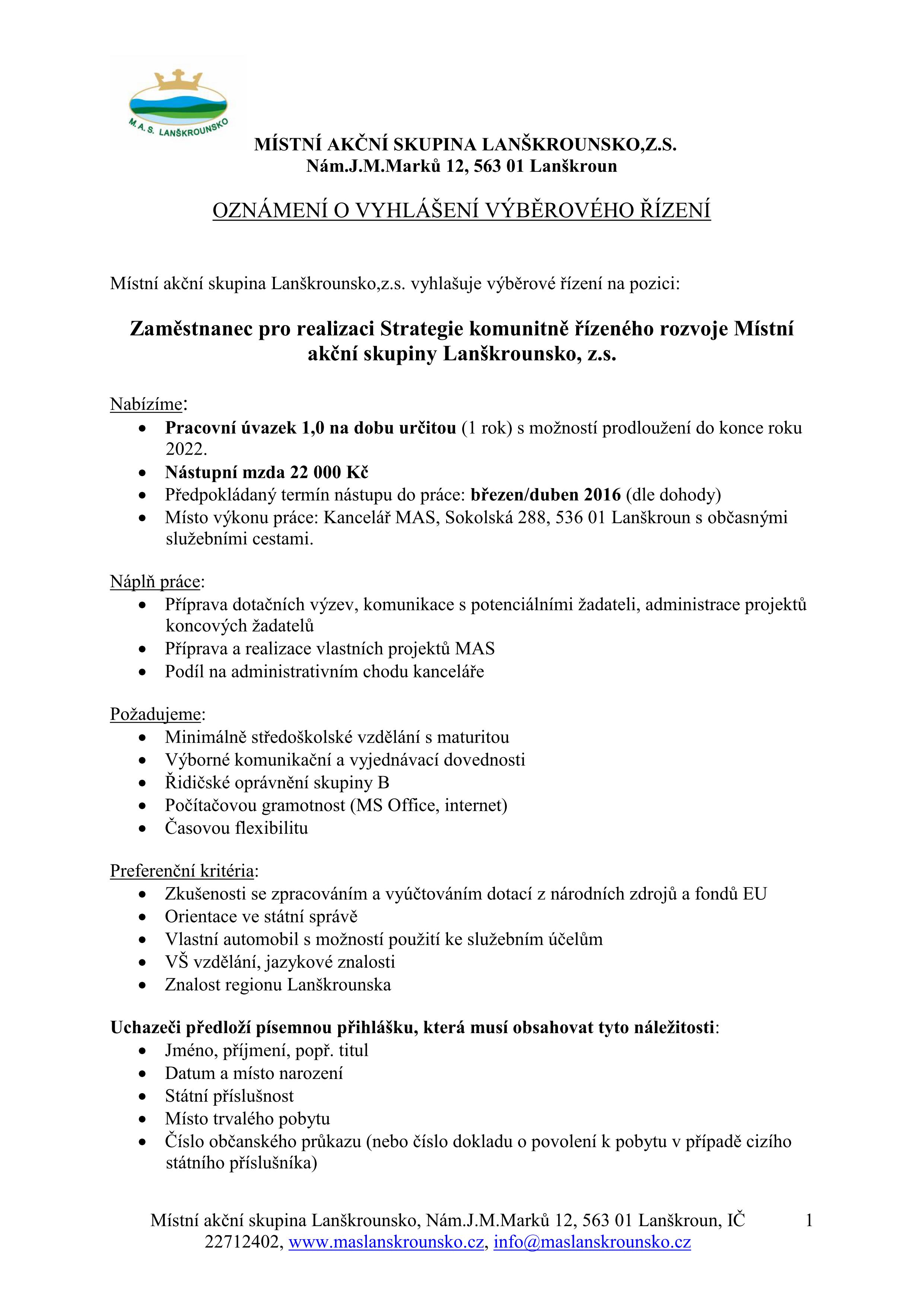 Místní akční skupina Lanškrounsko, z.s. vyhlašuje výběrové řízení na pozici: Zaměstnanec pro realizaci Strategie komunitně řízeného rozvoje Místní akční skupiny Lanškrounsko, z.s.