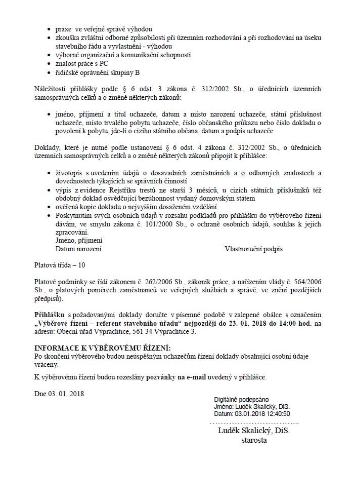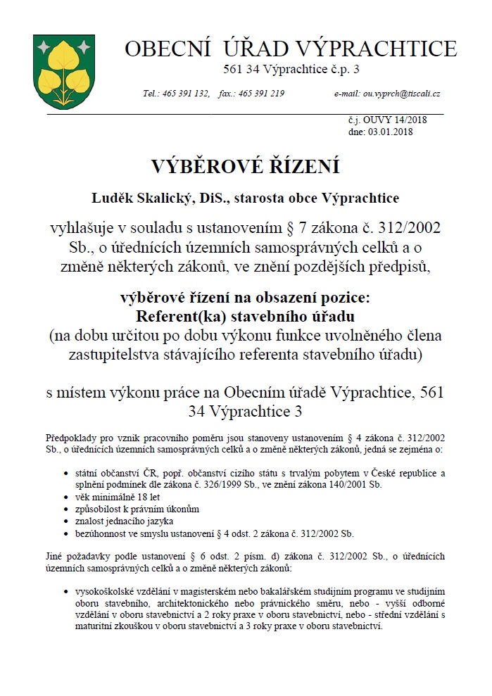 Výběrové řízení na pracovní pozici referent/ka stavebního úřadu ve Výprachticích