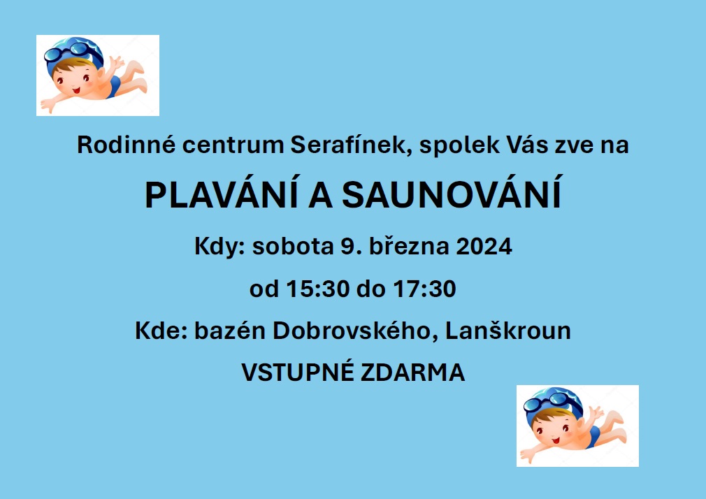 Plavání a saunování 9.3.2024 4 března, 2024 napsal(a) Petra Marková v kategorii Rodinné centrum Serafínek